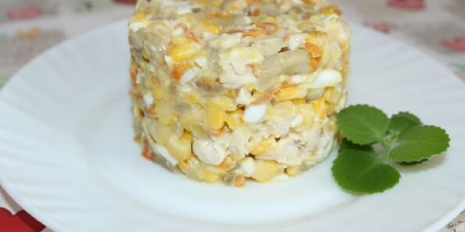 Спосіб приготування: гриби порізати шматочками, шинку та сир порізати кубиками, огірок – кружечками. Все перемішати, додати кукурудзу, майонез та спеції, знову перемішати.