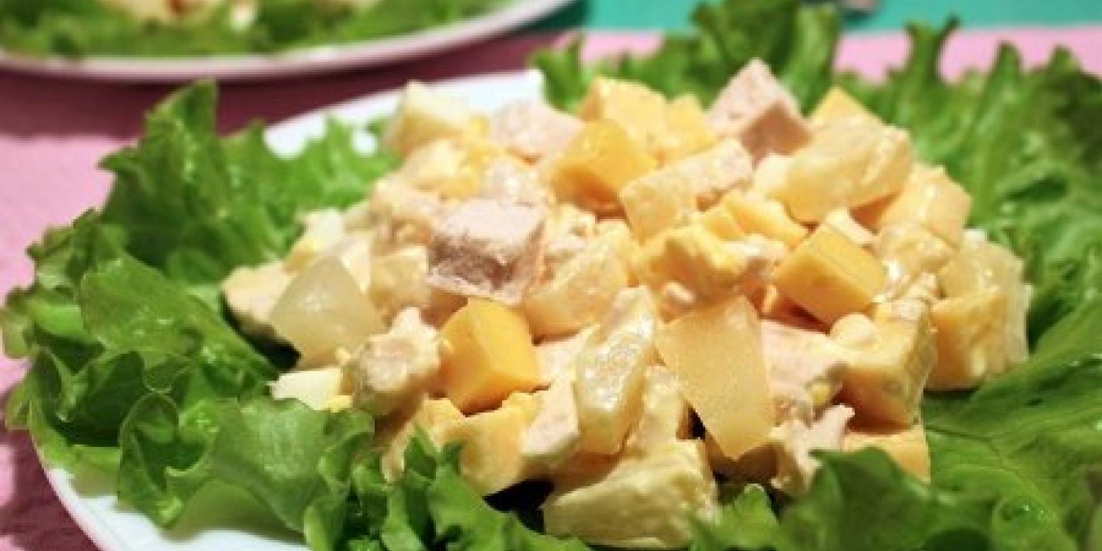 Спосіб приготування: ананаси порізати на шматочки. Філе промити, відварити та порізати шматочками. Сир порізати кубиками. Змішати всі інгредієнти, заправити натуральним йогуртом. Додати спеції за смаком. Готову страву можна викласти на листя салату перед подачею на стіл.