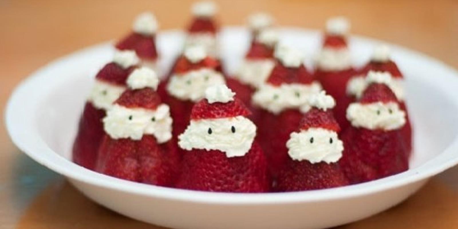 Спосіб приготування: сир змішати і з цукровою пудрою, сметаною і соком лимону. Утворену суміш збити блендером. Полуницю промити і просушити. Потім в кожної полуниці відрізати третину верхівки. Покласти ягоди на велику тарілку широкою частиною вниз. Утворену сирну масу викласти в кондитерський шприц і нанести декілька шарів крему на половинку полуниці. Зверху покласти «шапочку». Очі Санта-Клаусу можна зробити з маку або шматочків чорного шоколаду.