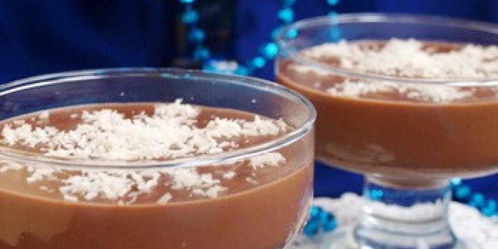 Спосіб приготування: спочатку слід нарізати цукерки на дрібні шматочки. Потім в 50 мл холодного молока розвести крохмаль. Молоко, яке залишилось, довести до кипіння. Далі додати цукерки і перемішати до утворення однорідної суміші. Після цього додати розведений крохмаль, какао і подрібнені горішки. Помішувати на маленькому вогні кілька хвилин. Коли маса трохи охолоне, її слід розлити у формочки і прикрасити кокосовою стружкою, щоб утворилася сніжинка. Готовий десерт треба подавати на стіл трохи теплим.