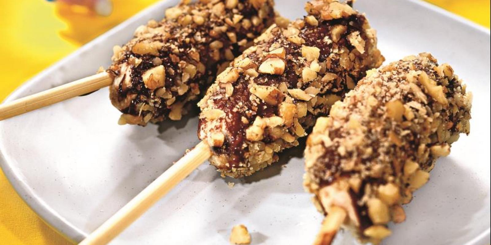 Спосіб приготування: банани очистити від шкірки, розрізати поперек на дві половинки. В кожну половинку треба вставити паличку для морозива і покласти на 20 хвилин у морозильну камеру. Горіхи подрібнити ножем. Шоколад розтопити на водяній бані, додати олії і перемішати. Кожен банан опустити в шоколад, дати йому трохи застигнути, а тоді посипати горіхами. Банани викласти на тарілку і помістити в морозильну камеру на 2 години.