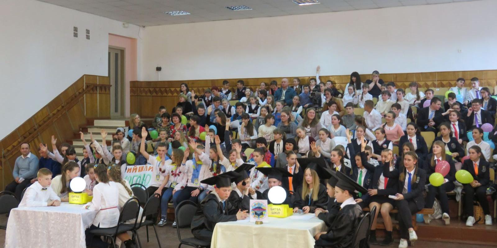 Вчора діти взяли участь у проекті «Битва шкіл». Маленькі хмельничани відповідали на запитання ведучого про історію міста та України, принципи місцевого самоврядування та багато іншого. Незважаючи на обмеженість часу, діти проявили злагодженість, кмітливість, рішучість та показали гарні знання. Школярі швидко та впевнено давали відповіді на питання. Учасників команд підтримували їхні друзі та активно за них вболівали. Вони також відповідали на питання ведучого.